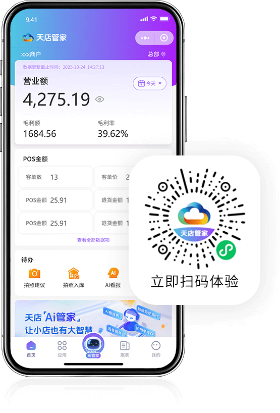 轻量化的手机小程序架构,摆脱对电脑后台的登录依赖,功能覆盖商品、会员、采购、盘点、POS设置等全流程管理场景,依托手机与Ai能力的结合,可将整体操作